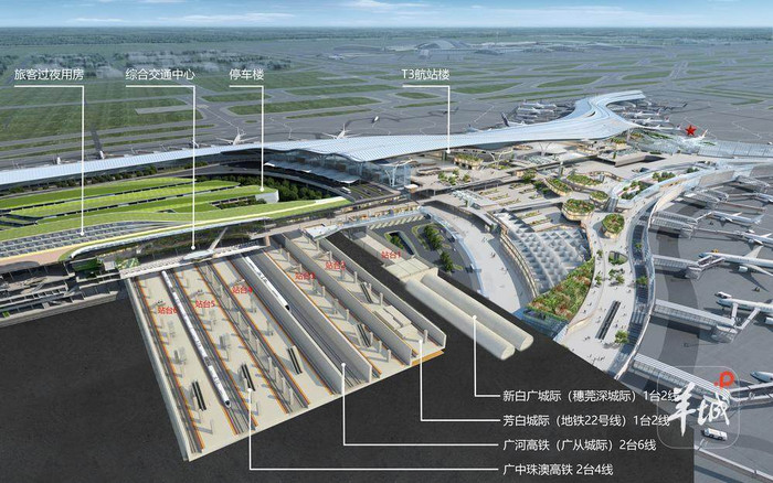 据悉,广州白云国际机场三期扩建工程,囊括两条4E级跑道——西二跑道(第四跑道)、东三跑道(第五跑道),一座航站楼——T3航站楼,同步在T3航站楼前建设综合交通中心,引入地铁、城际、高铁等轨道交通线路,共同打造具有全球竞争力的“零换乘、一体化”空铁联运交通枢纽,建设东四、西四指廊等。