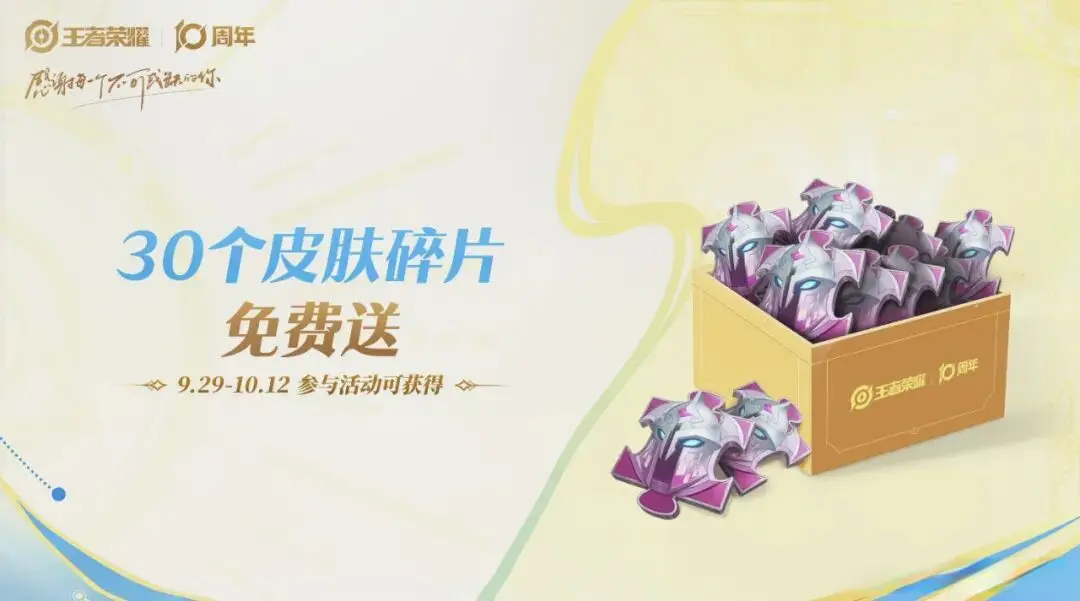 先说免费皮肤,9月25日起,参与活动能从2 - 9周年限定皮肤和十周年三星堆主题史诗皮肤里选一款免费拿,像甄姬的游园惊梦、杨玉环的遇见飞天都在里面。皮肤碎片免费领